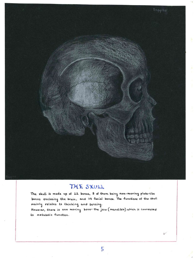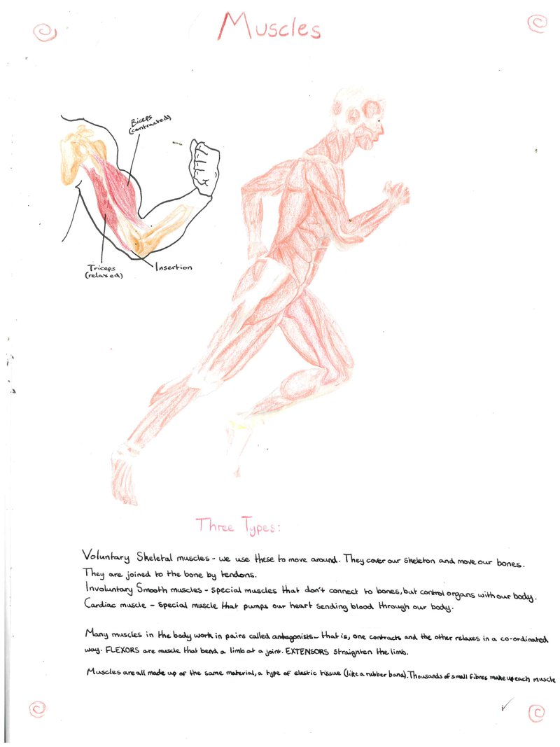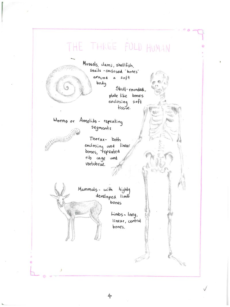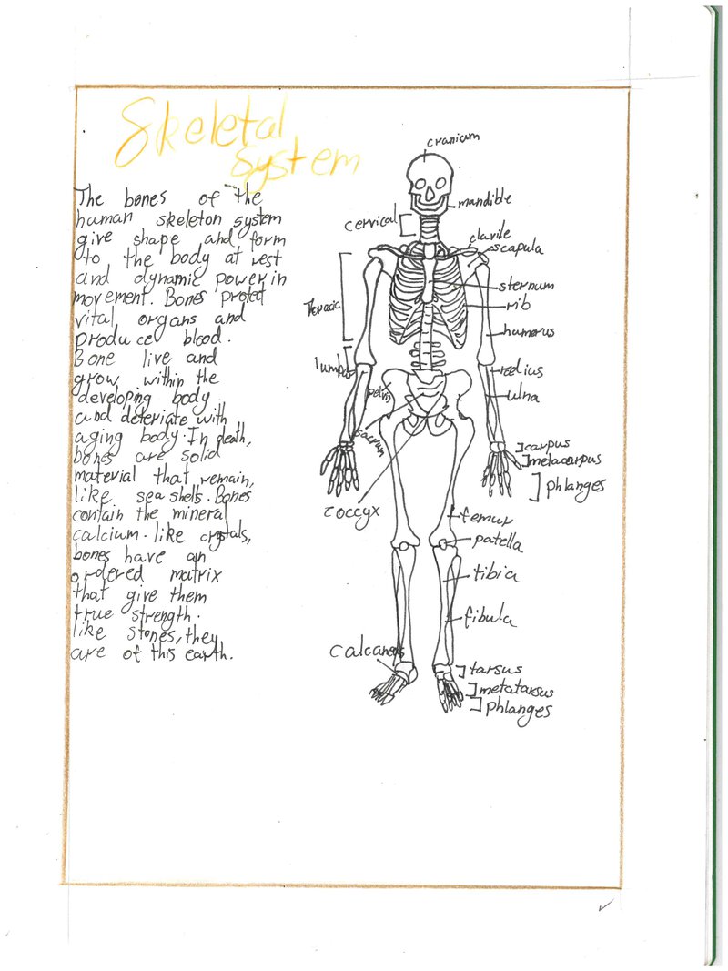 In this Year 8 Anatomy Main Lesson students learned not only about their body, bones and muscles, but also the engineering feat of who we are. They learned how our thinking is reflected, not only through the shape of our skull which houses our brain in stillness, feeling shown through our trunks, where the repeated bones of our ribs contain our heart and lungs and finally our will in the action of our limbs to cause us to do things.