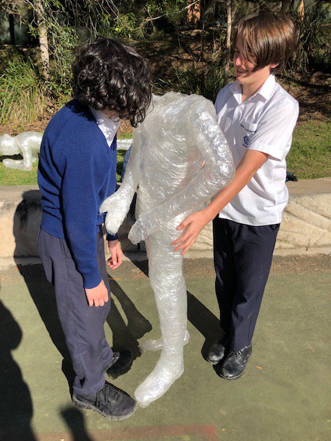 You can see here that Year 9 welcomed a new student who had them all beat on time for holding a plank position. As hard as they tried, none could compete with the new arrival into class! In all seriousness, the ceramics and sculpture group have recently been developing figurative works out of packaging tape! The students literally use each other as models and wrap the tape around themselves which is then cut away and re-attached. The resulting affect are life-size figures that enhance the school and ensure there is a bodily presence in all areas at all times! What fun they all had and the results were amazing as seen here.