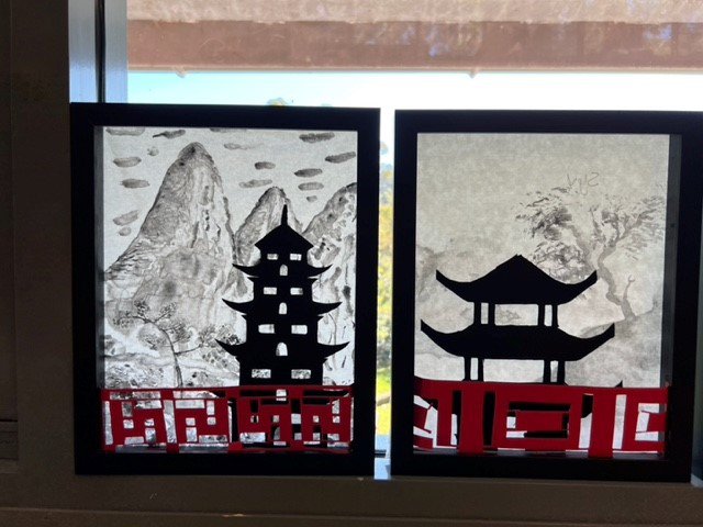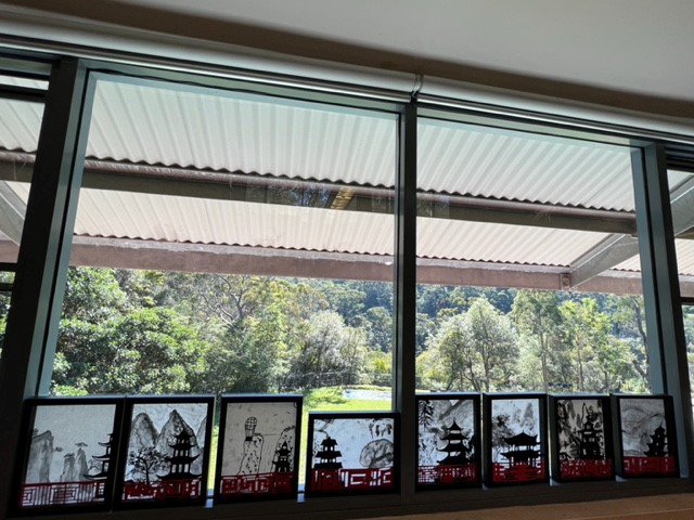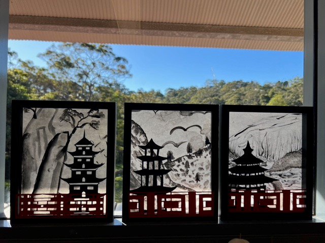 Yr 7 has been constructing dioramas in Visual Arts. They learned about traditional Chinese landscape paintings and used India ink with squirrel brushes on rice paper to obtain the background effect. They carefully cut out silhouettes of Asian temples and red gates, learning a little bit about their purpose and symbolism. Students worked with great skill and consideration on this project with outstanding results!