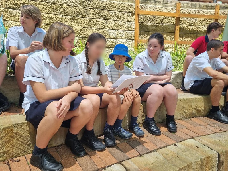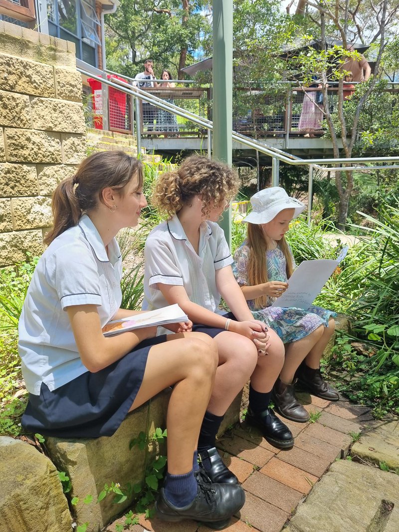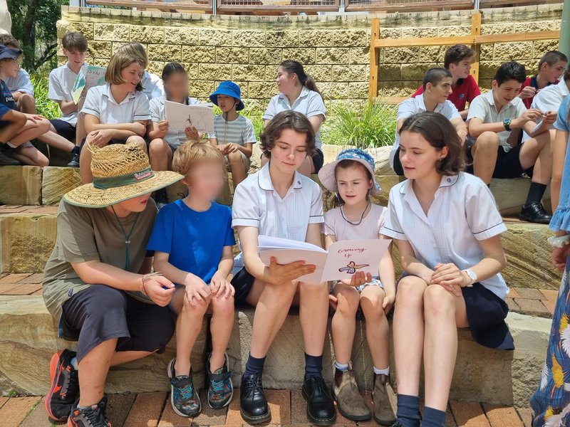 Our Year 9 students wrote stories for our incoming 2024 Class 3 students and presented these to them at their Middle Cove Orientation Day last Friday, 1st December. Supported by Yr 9 teachers, Lydia Wilson and Ella Pooley, we captured the sweet moments of reading at the amphitheater.